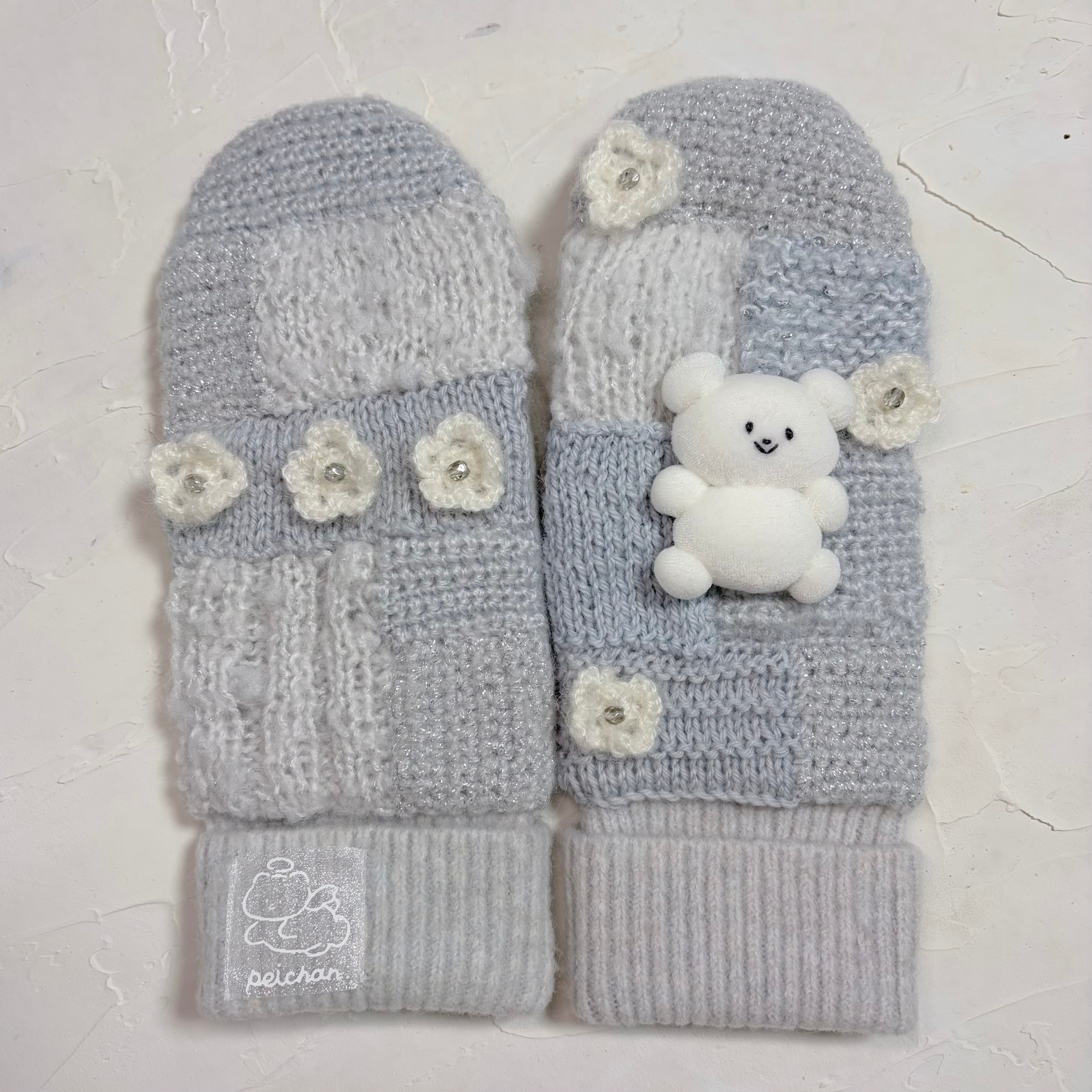 手編みのパッチワークが可愛い1点ものの手袋です。