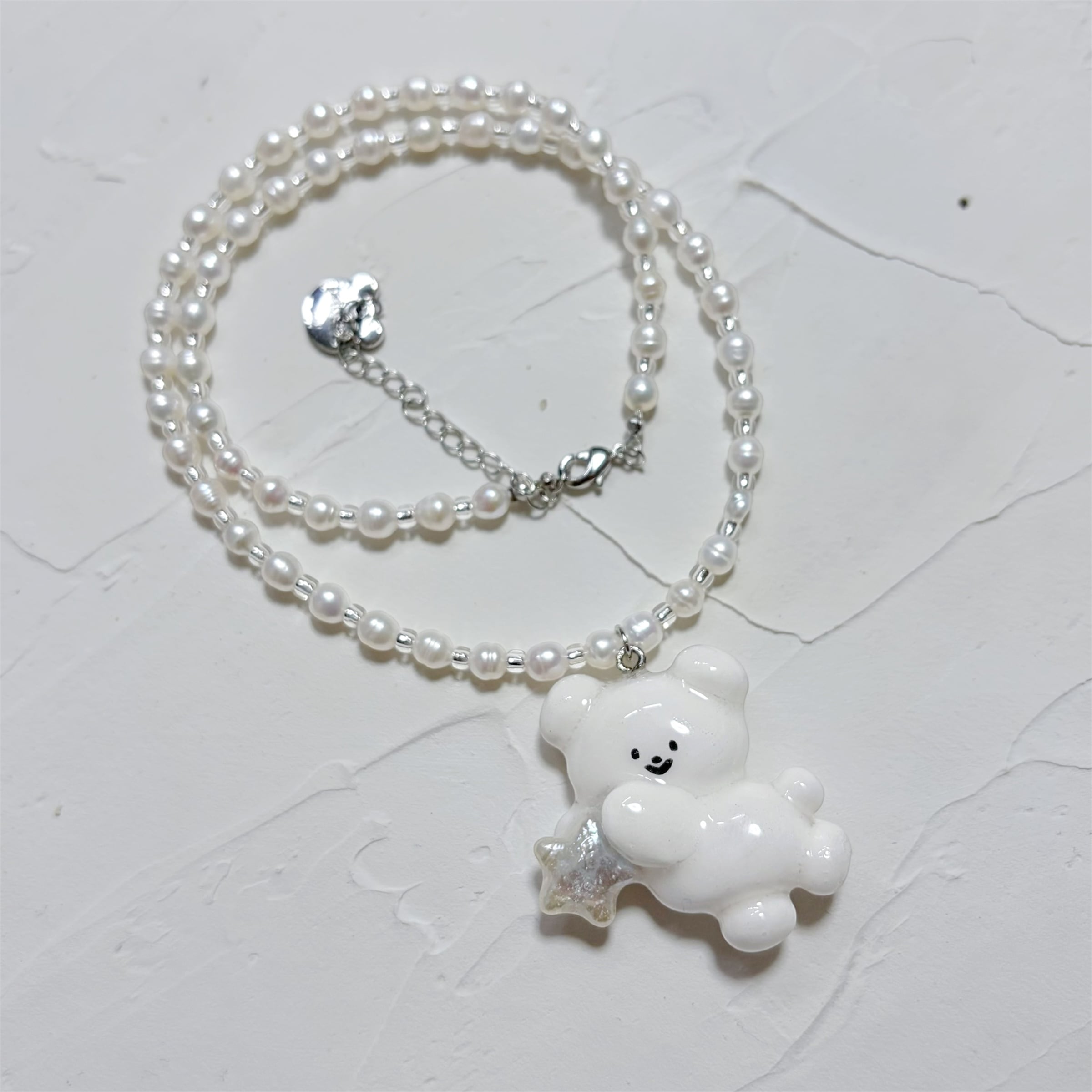 星の淡水パールを持った、大きなくまちゃんのネックレスです。