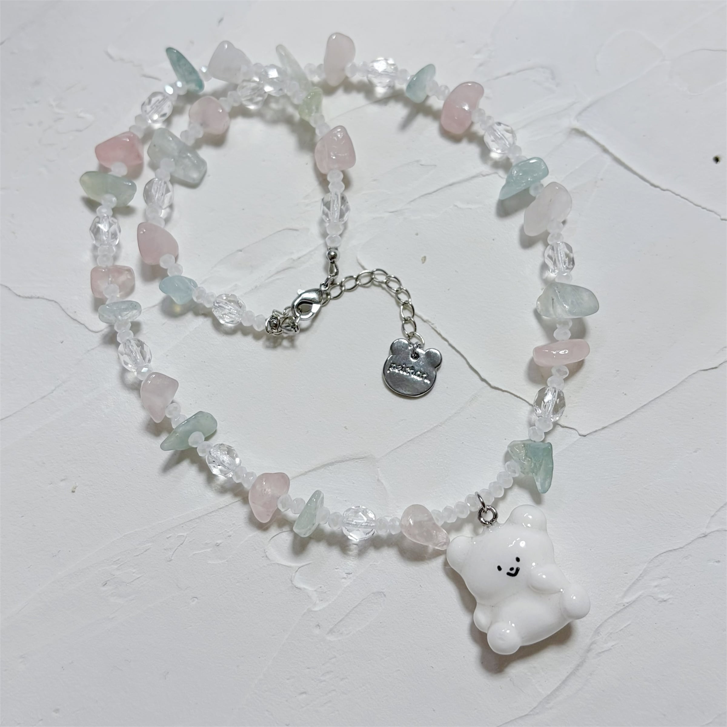 ピンクとグリーンの天然石が可愛い、大きなくまちゃんのネックレスです。