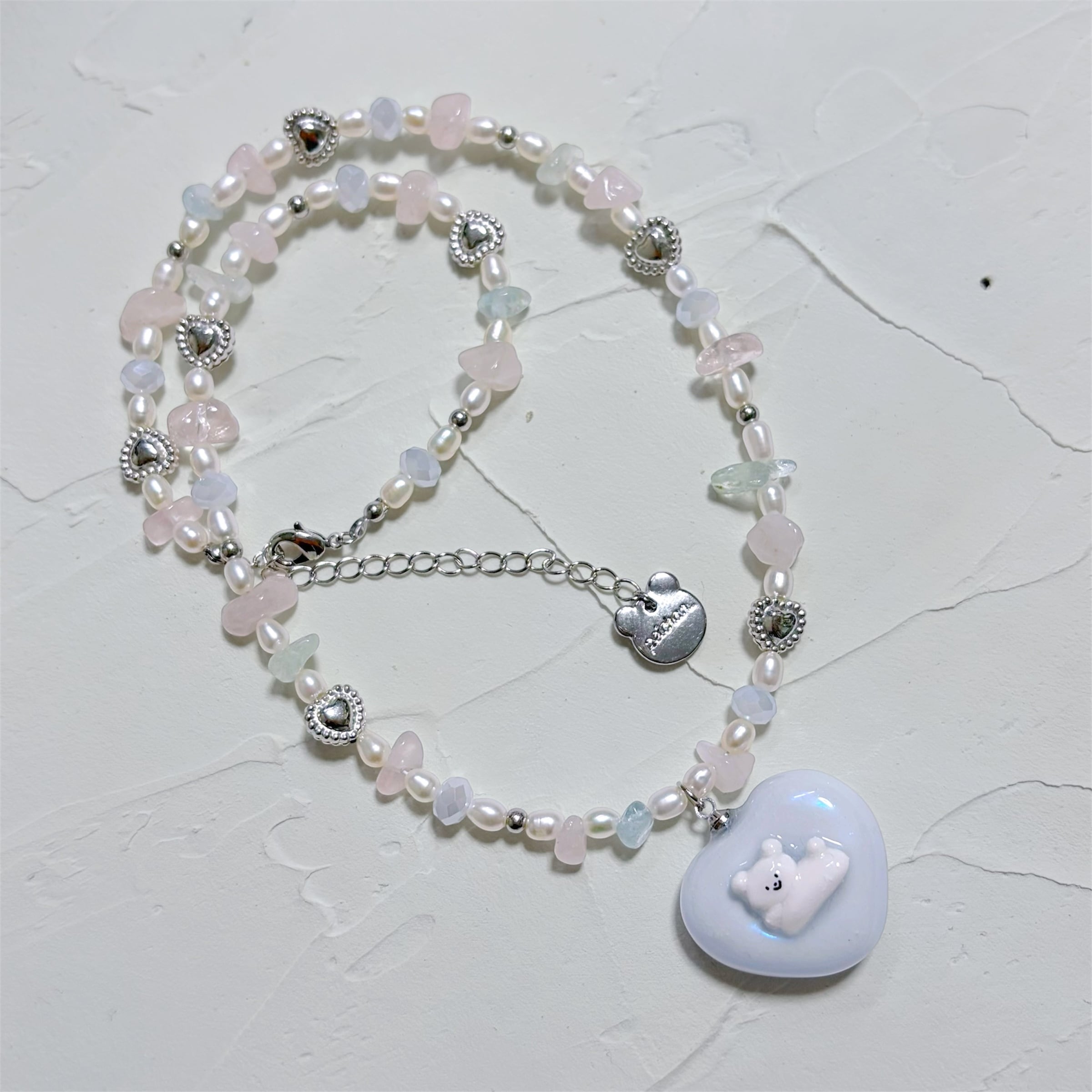 天然石や淡水パール、ビーズなど組み合わせた、春らしい淡いカラーのネックレスです。